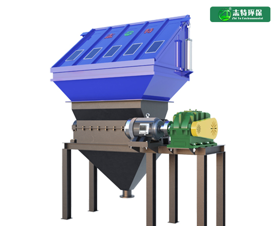 該動(dòng)物尸體破碎機(jī)為單軸破碎機(jī),該單軸破碎機(jī)主要由密封料倉、破碎腔、破碎刀軸、動(dòng)力機(jī)構(gòu)、機(jī)架、出料倉、觀察檢修口等部件組成,
